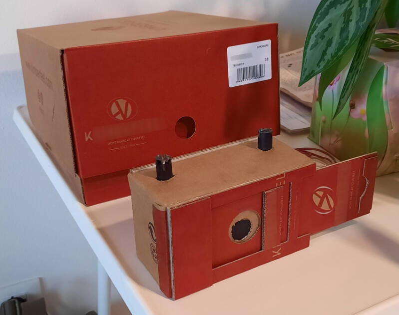 Apparecchio per la fotografia senza obiettivo (incompleto, manca il piccolo foro) ottenuta da una scatola da scarpe.